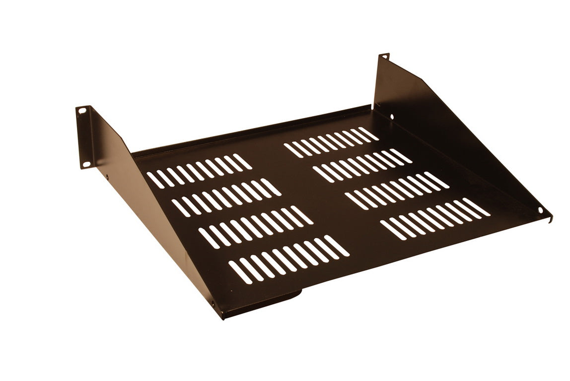 This 1U utility rack shelf is 15" deep and has elongated vent holes for optimum air circulation. It features cold rolled 16 gauge 1.5mm steel construction and a black powder-coated finish. It is rear flanged for rigidty.