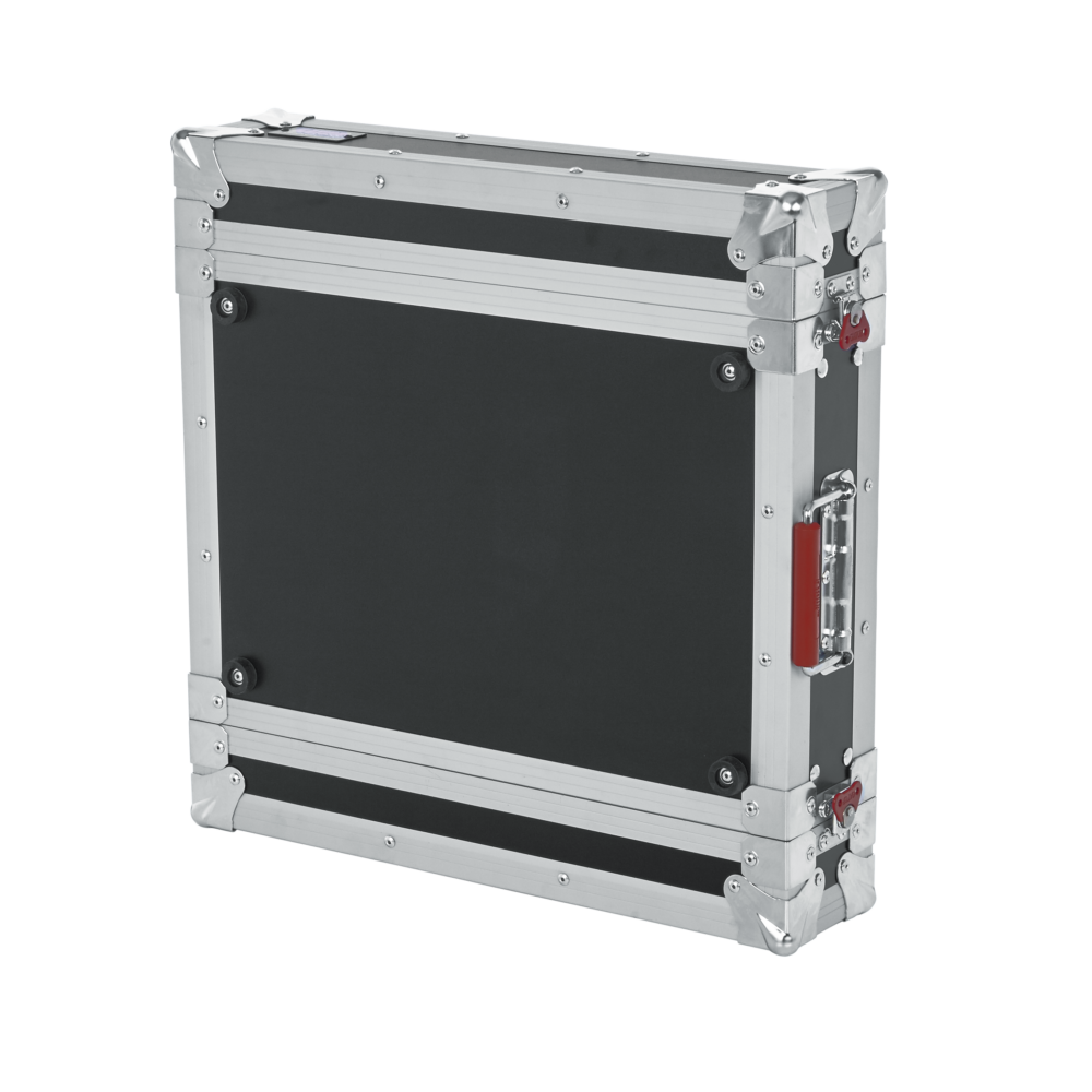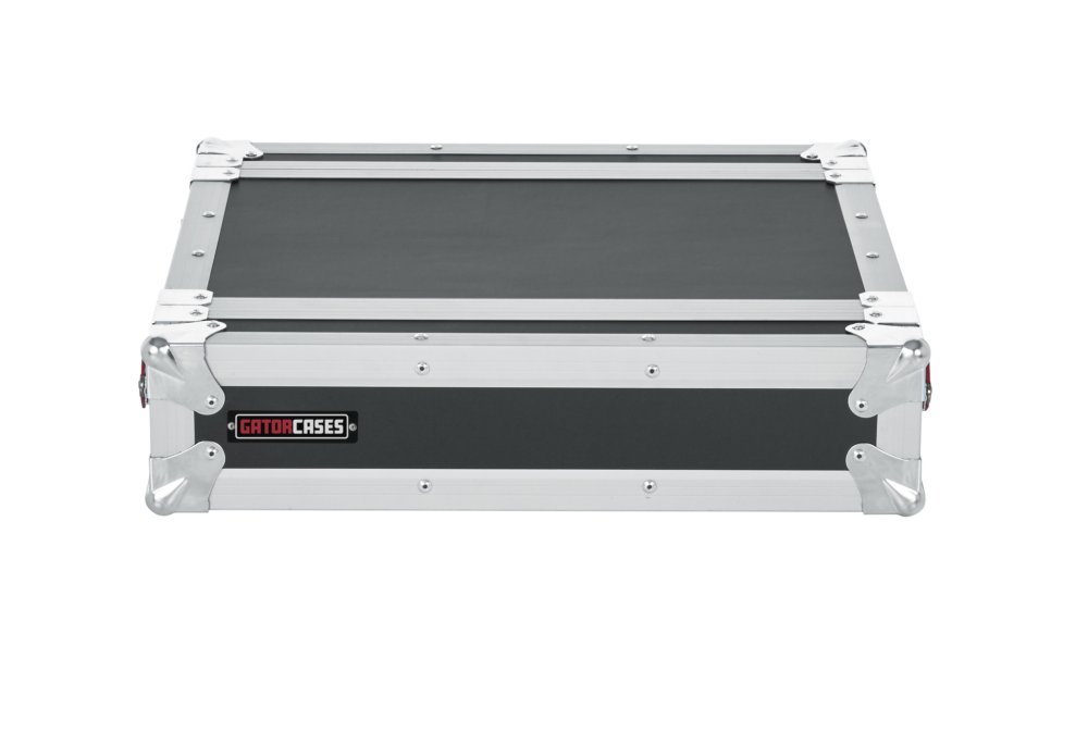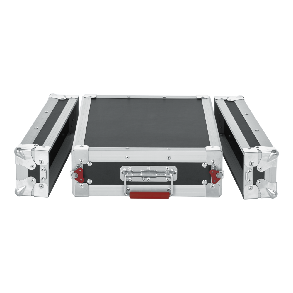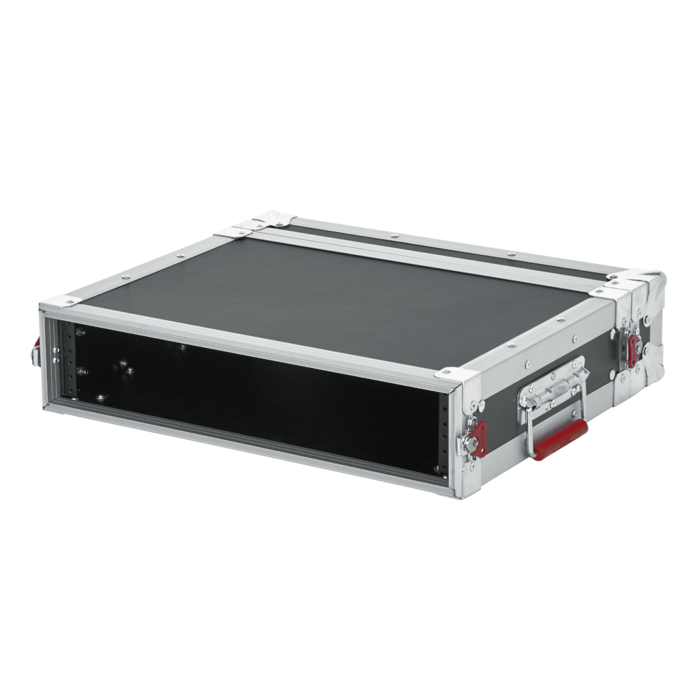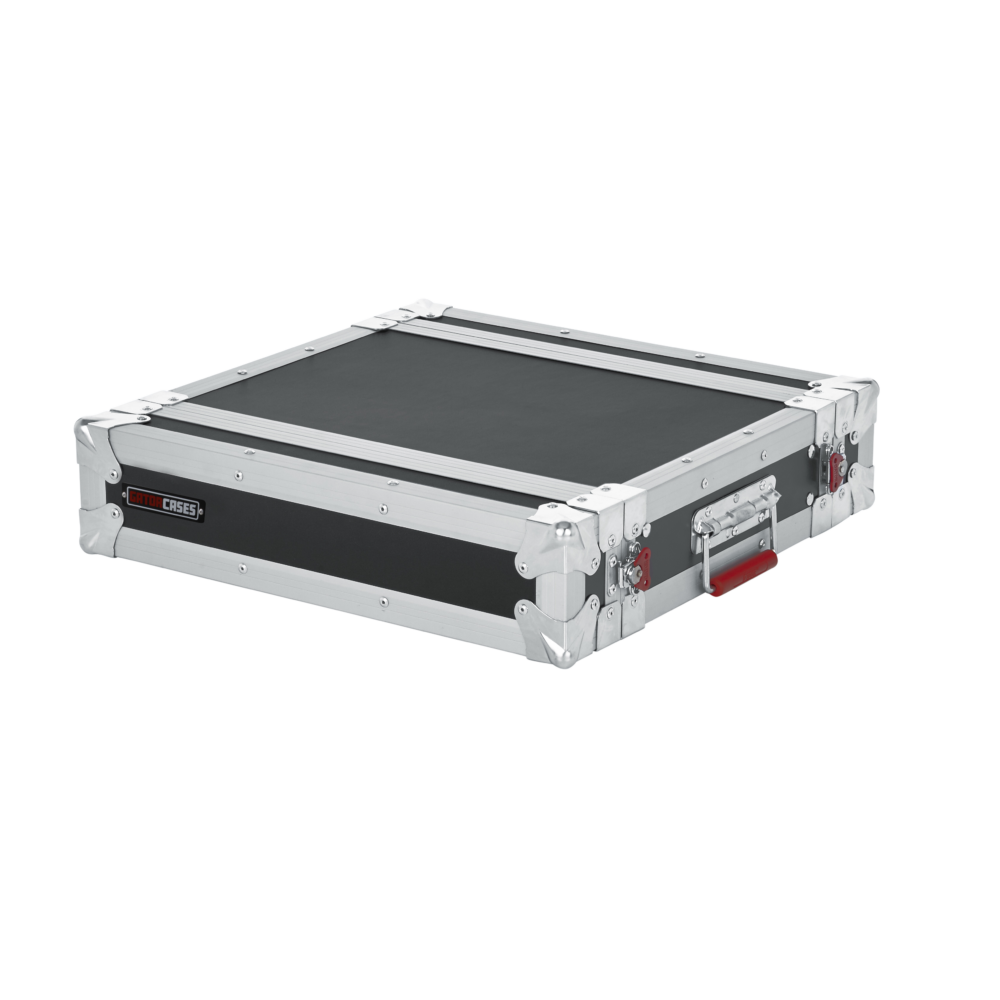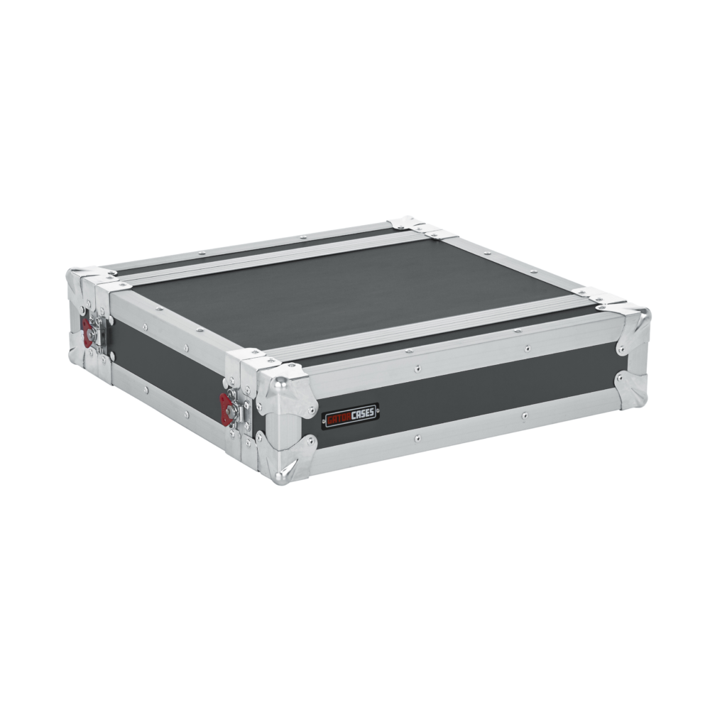 This ATA 2-space shallow rack mount road case features 9mm plywood construction with a PVC exterior and a tongue-and-groove extrusion aluminum valance. It has 3.2mm thick front and rear rack rails; heavy-duty zinc plated hardware; spring loaded recessed handles and latches, and reinforced stackable corners.