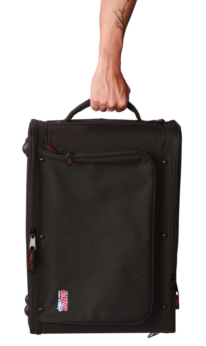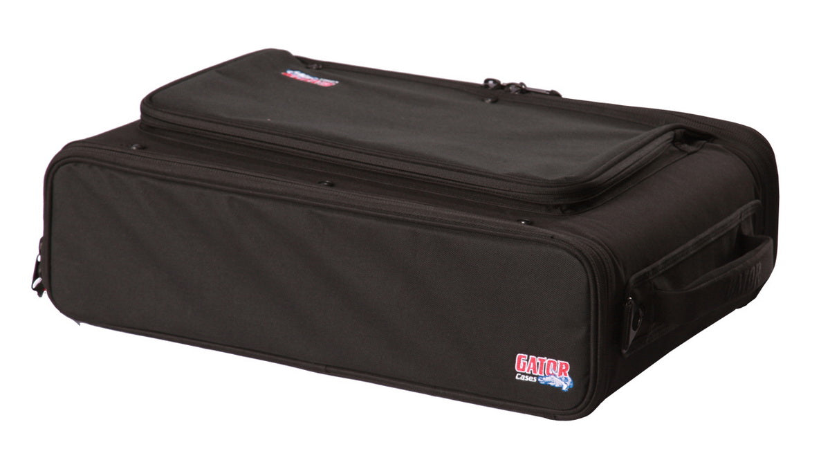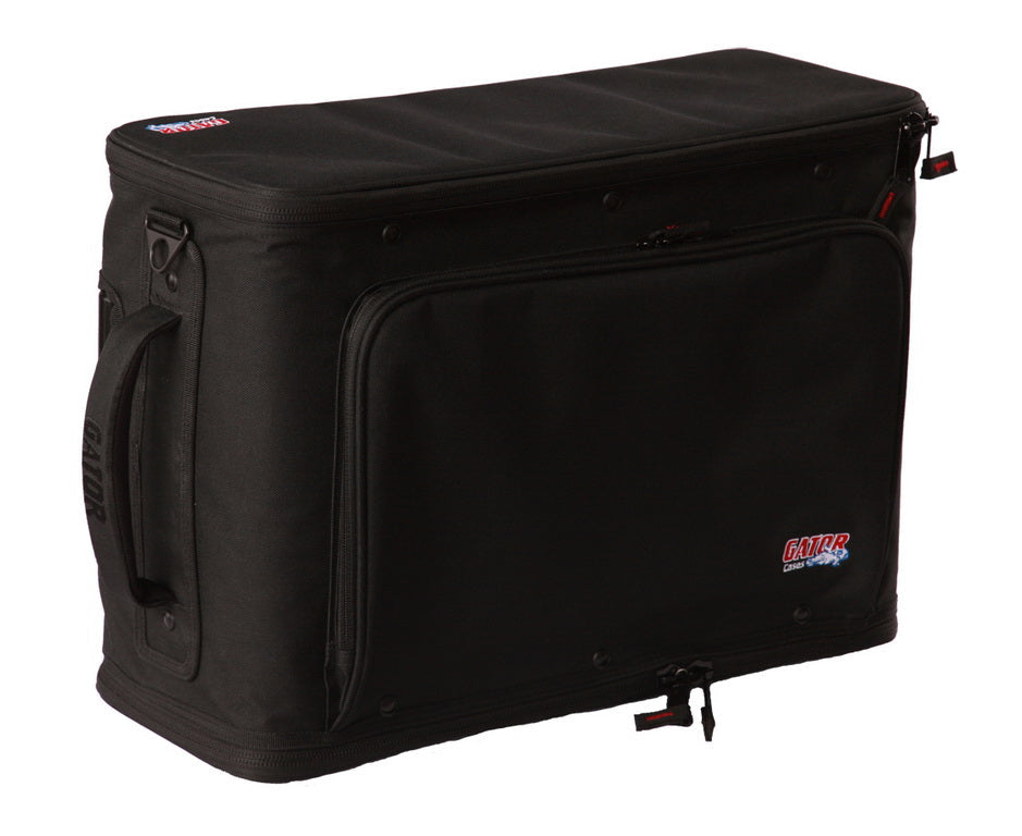 Gator Cases GR-RACKBAG-3U 3U Lightweight Rack Bag is great for effects processors, recording and audio equipment, and sound modules. Constructed of 600 Denier nylon exterior with polyethylene reinforced interior frame and internal reinforce aluminum valance. An ergo grip carry handle makes for easy transportation. It's rear flap allows for access to entire panel of equipment and exterior pocket for cables make this the ultimate 3U rack bag.