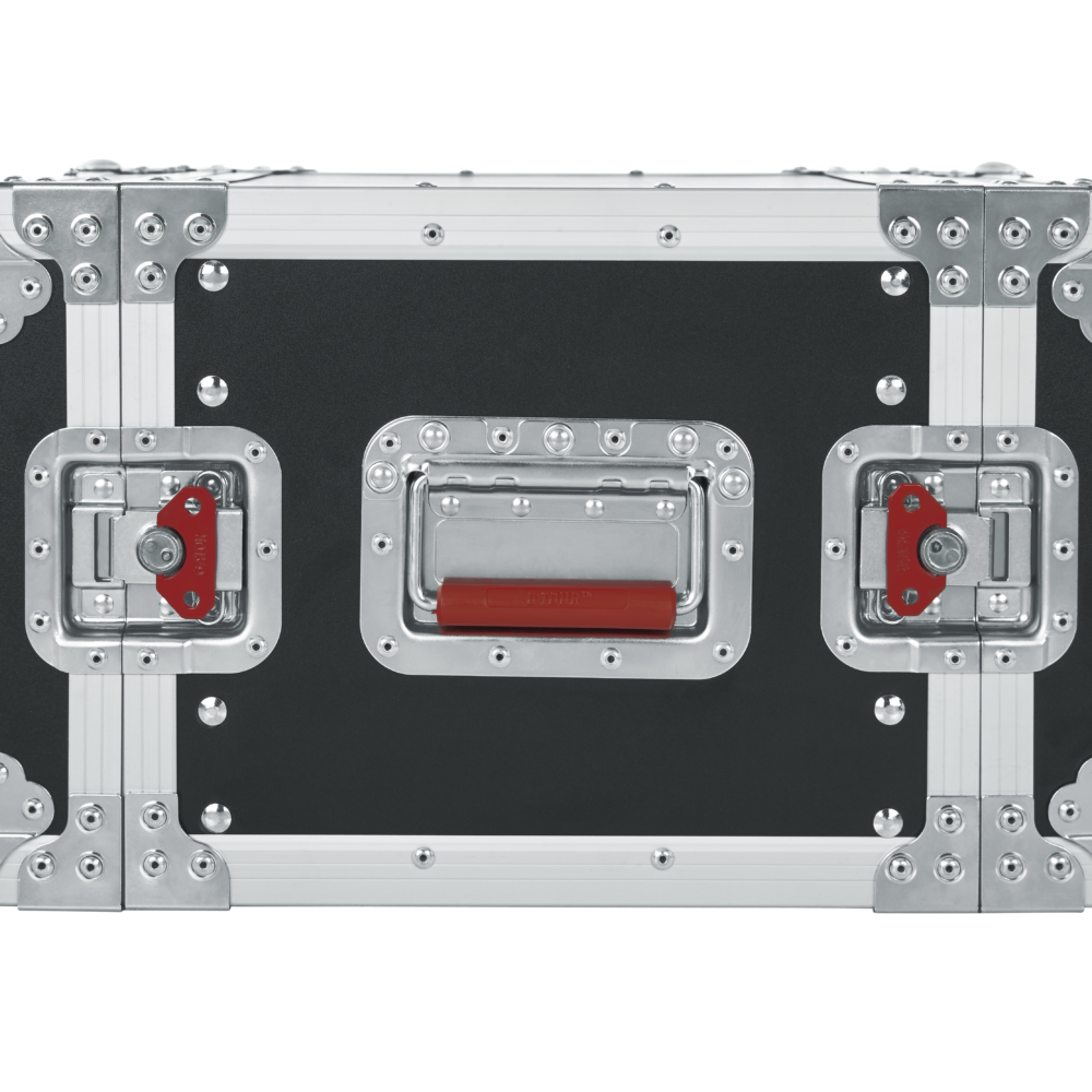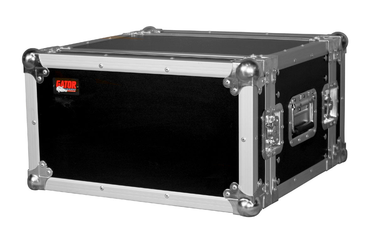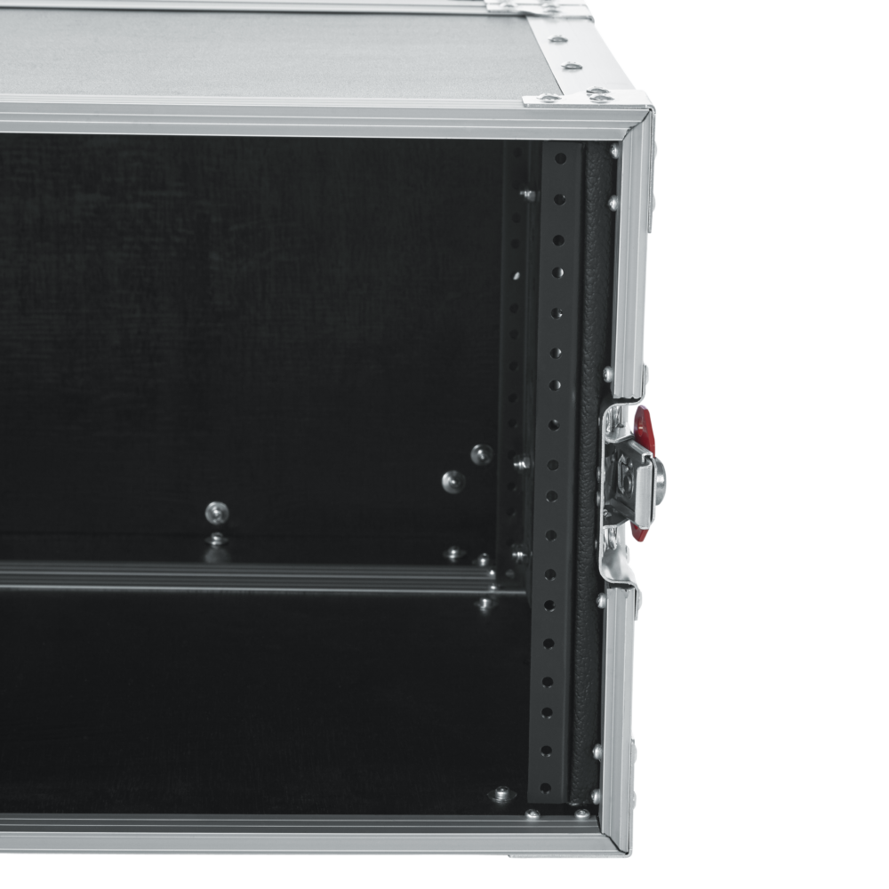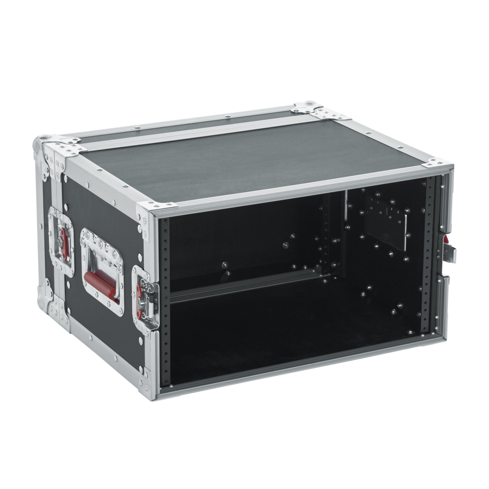 This ATA 6-space shallow rack mount road case features 9mm plywood construction with a PVC exterior and a tongue-and-groove extrusion aluminum valance. It has 3.2mm thick front and rear rack rails; heavy-duty zinc plated hardware; spring loaded recessed handles and latches, and reinforced stackable corners.