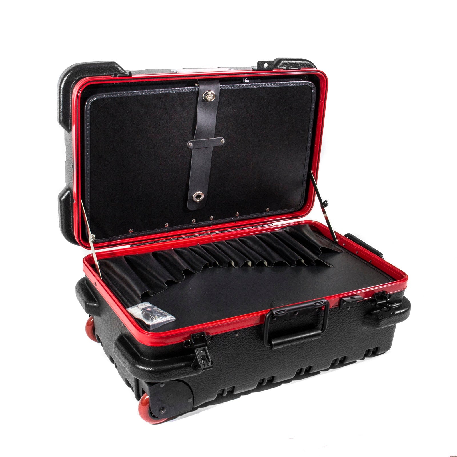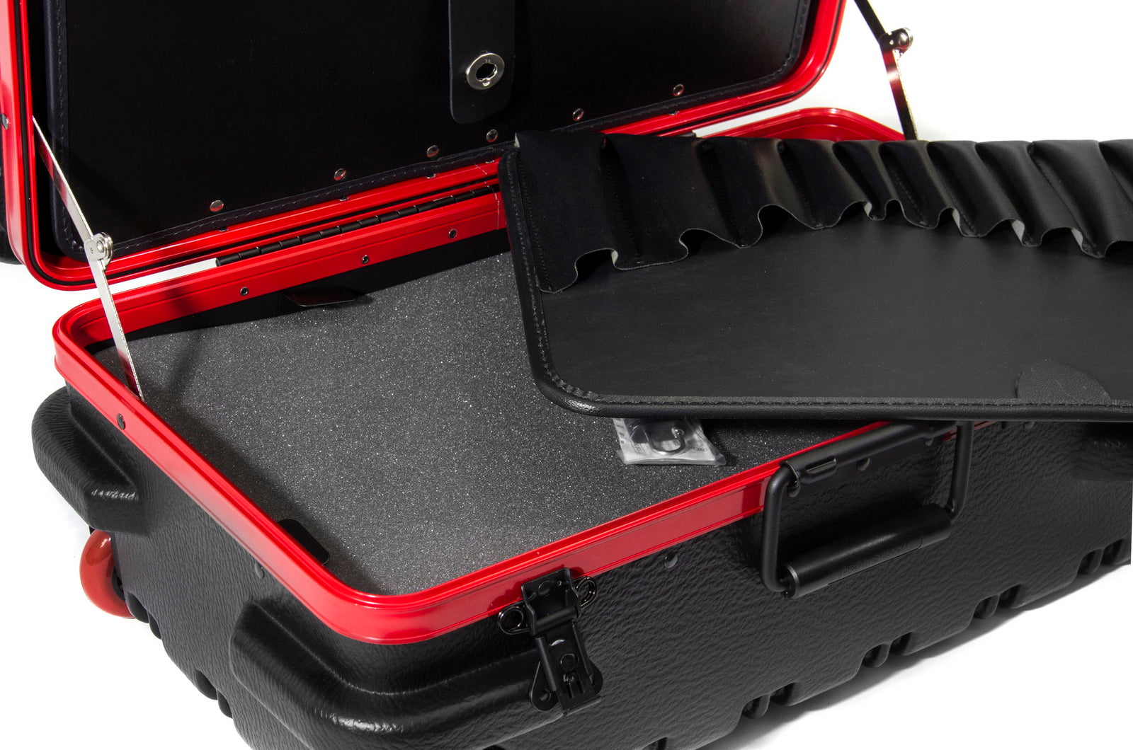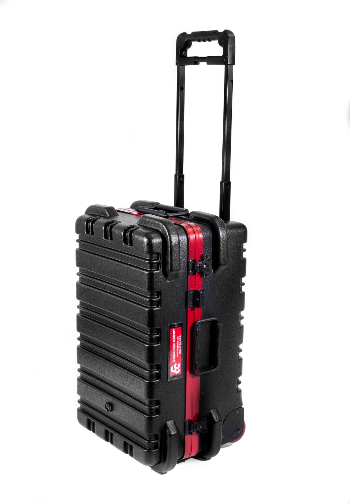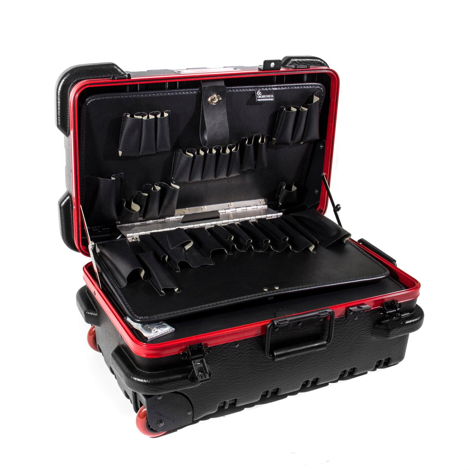 Chicago Case's 30th Anniversay Slim Line Tool Case is a military-style tool case with high-impact black polyethylene plastic, 25% thicker than our standard cases. This case offers a slimline profile of 12.5" vs. normal 15.0" from front-to-back. It has an aluminum tongue-in-groove frame to resist dirt and moisture and features eight external protective bumpers. The case includes our unique V-hinged top pallet with bottom pallet to hold more than 50 tools (not included), a TSA approved 3-digit combination lock and plank foam in the base. Tool case capacity is approximately 70-75 lbs. This case is part of our Red Line Premium Military-Style Tool Case line and comes with a red tongue-in-groove frame and red wheels.