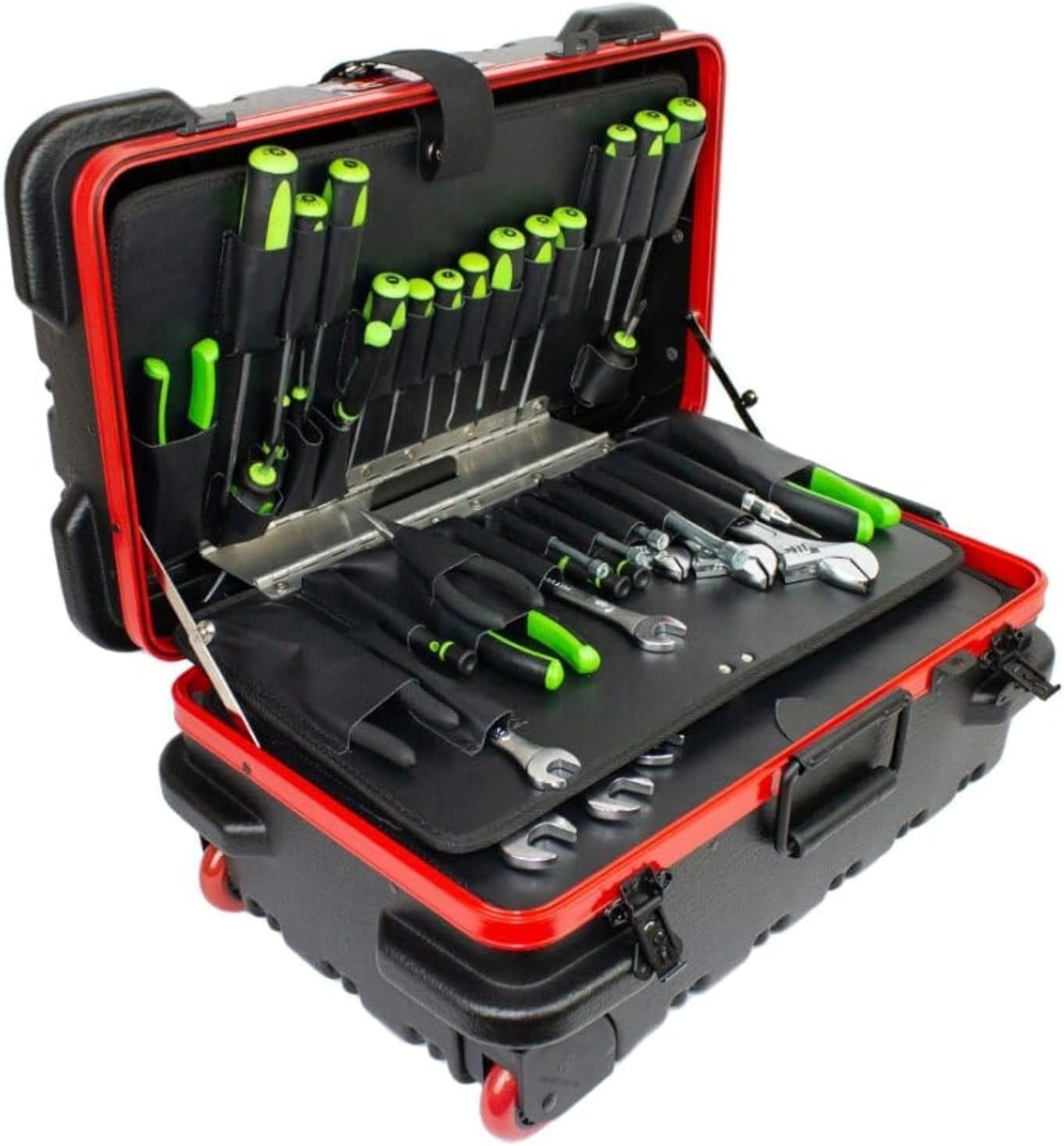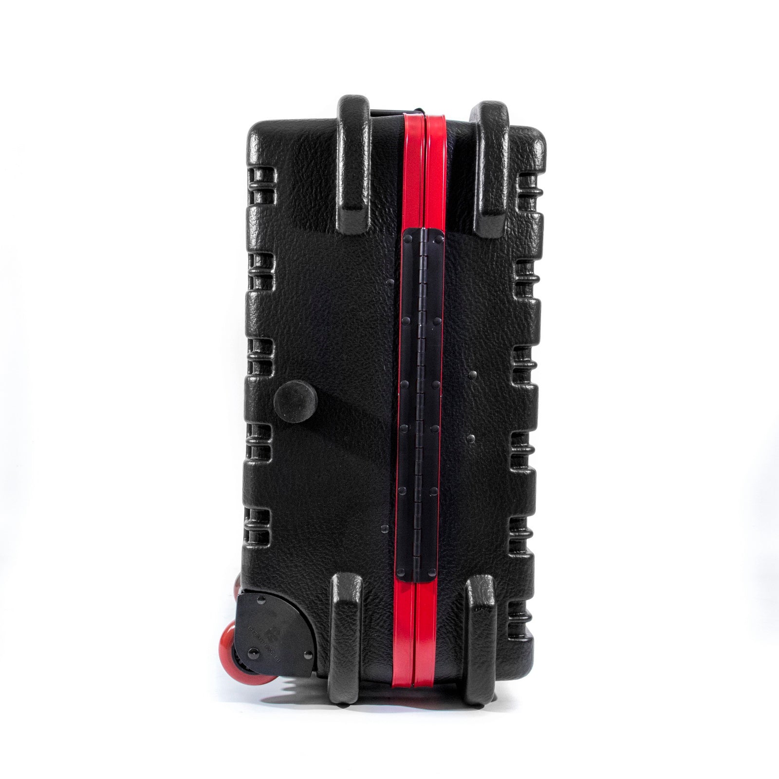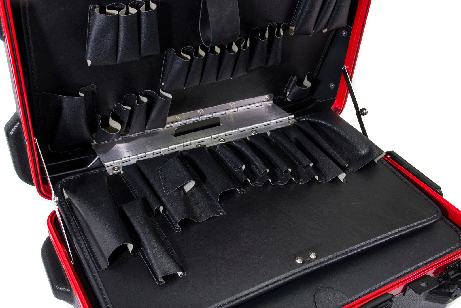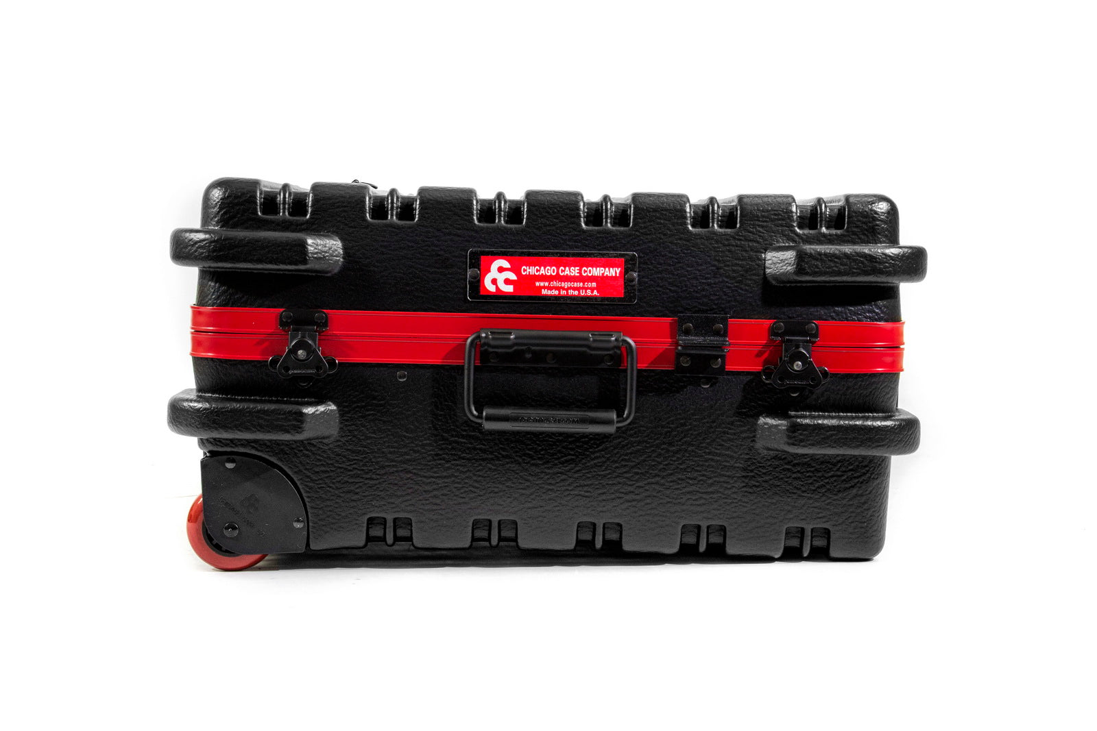 Chicago Case's 30th Anniversay Slim Line Tool Case is a military-style tool case with high-impact black polyethylene plastic, 25% thicker than our standard cases. This case offers a slimline profile of 12.5" vs. normal 15.0" from front-to-back. It has an aluminum tongue-in-groove frame to resist dirt and moisture and features eight external protective bumpers. The case includes our unique V-hinged top pallet with bottom pallet to hold more than 50 tools (not included), a TSA approved 3-digit combination lock and plank foam in the base. Tool case capacity is approximately 70-75 lbs. This case is part of our Red Line Premium Military-Style Tool Case line and comes with a red tongue-in-groove frame and red wheels.