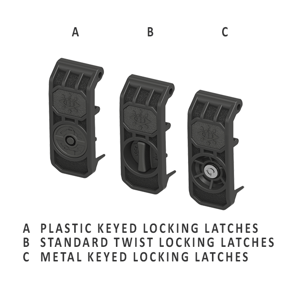 Keyed Locks: Available with latches with keyed chrome metal locks or plastic non-corrosive locks.