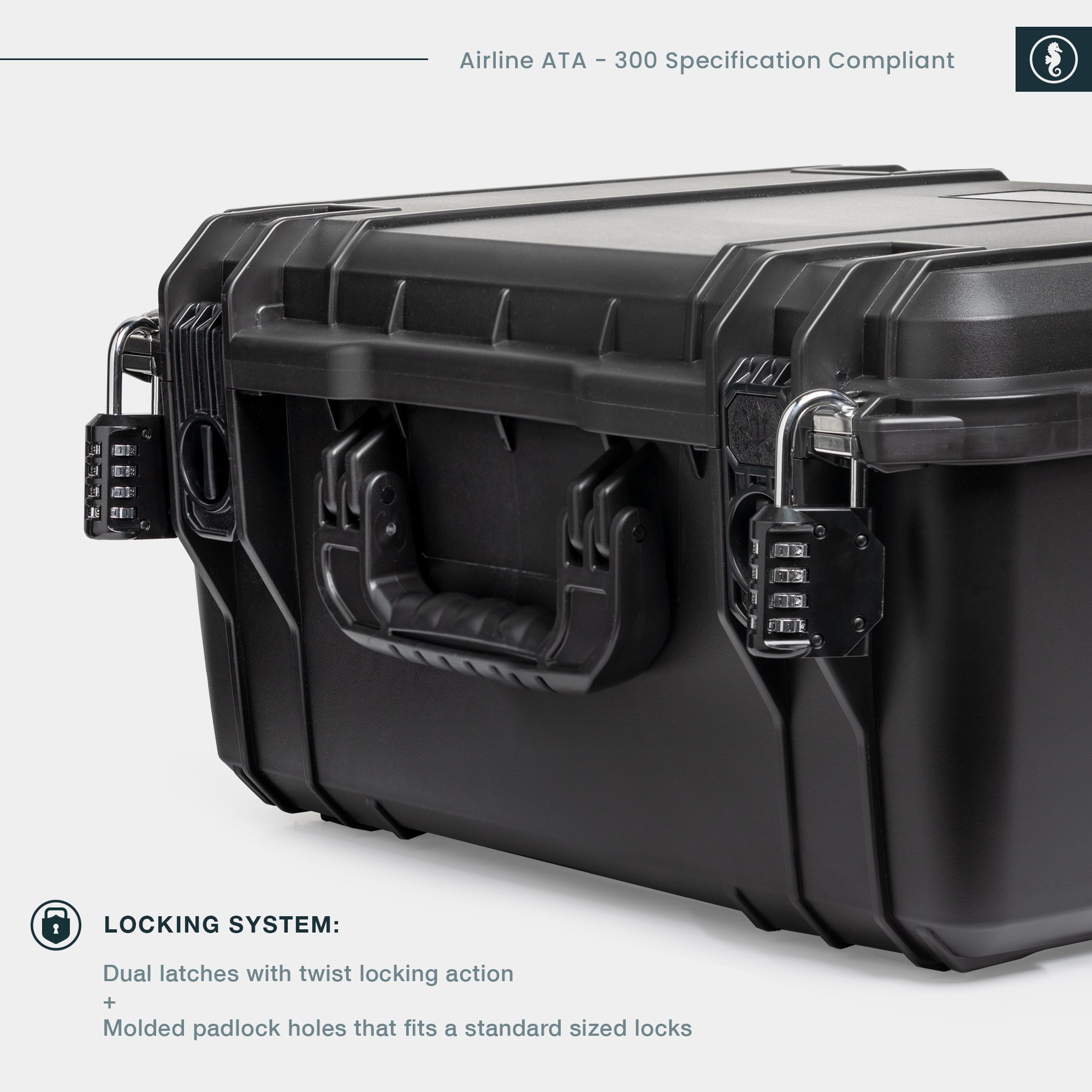 Every Seahorse case is meticulously crafted to meet the highest standards of performance. The dual twist locking latches ensure a secure closure, while the molded-in padlock hole accommodates standard-sized master locks, adding an extra layer of security. Additionally, the automatic pressure release valve safeguards against pressure build-up and guarantees a perfect seal, thanks to the incorporation of its own O-Ring under one of the latches.