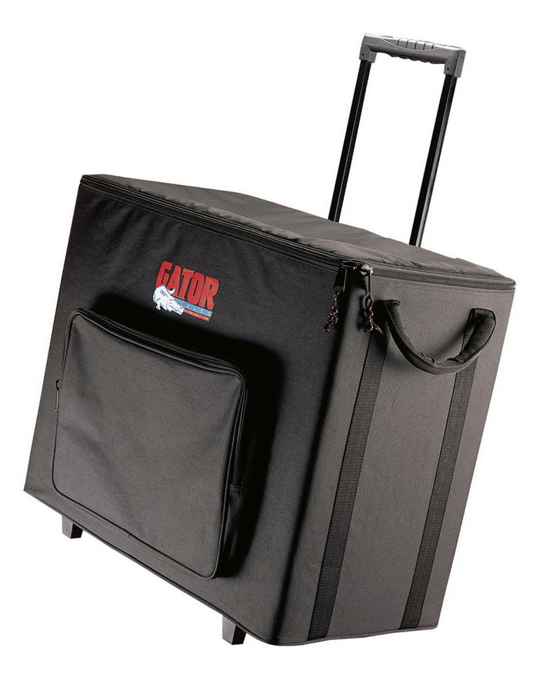 Gator Cases G-112A rolling industrial case is constructed with rugged 600-Denier material over 1/2" plywood frame and a 20mm Tricot-covered foam interior. A reinforced hard top supports an amplifier on stage and rails prevent the amp from vibrating off the stand during performances. The case features an external accessory pocket for storage and a tow handle and plastic wheels for easy transport.